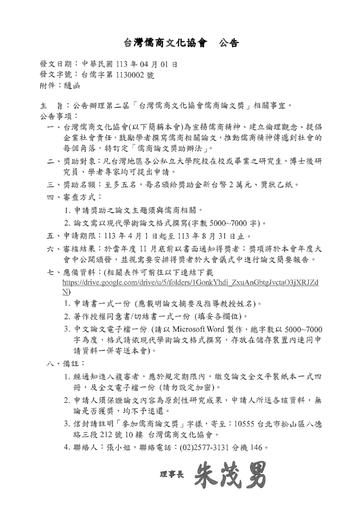 信封請註明「參加儒商論文獎」字樣,寄至︰ 10555台北市松山區八德路三段212號10樓台灣儒商文化協會。